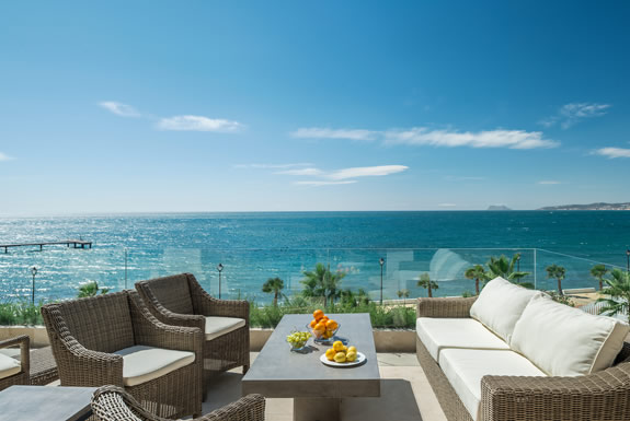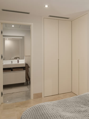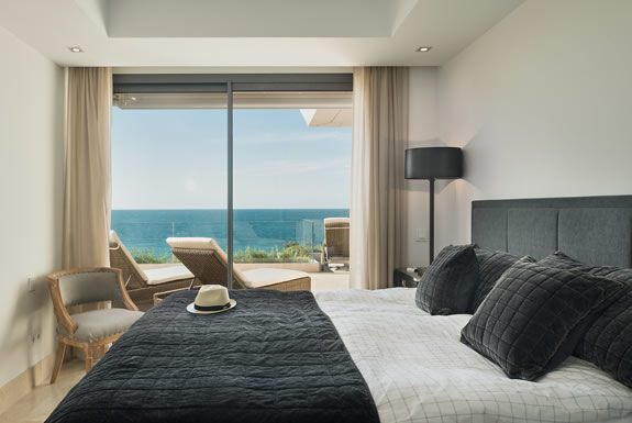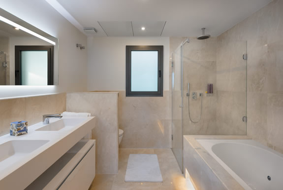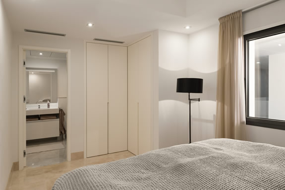 All the three spacious bedrooms are air conditioned and have electric blinds. The master suite is located at the front of the apartment with direct access to the front terrace and enjoys sea views. This bedroom has a super king size bed (180 cm) and an ensuite bathroom with a jacuzzi bath, separate walk-in shower, wc & basin.