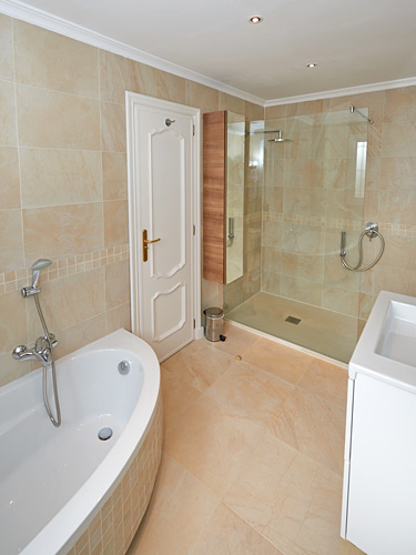 Up a flight of stairs you will find 3 air conditioned bedrooms: a double bedroom at the rear of the house with a super king size bed (180 cm), ceiling fan, small terrace and an ensuite shower room with a walk in shower, wc & basin.