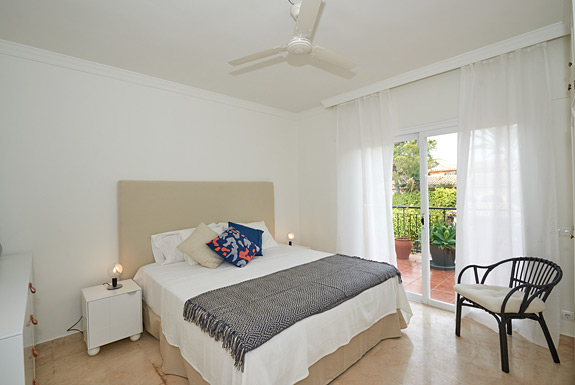 At the front of the house is the master bedroom with a super king size bed (180 cm), ceiling fan, and an ensuite bathroom with a bath, separate walk in shower, wc & basin. This bedroom also has a large south facing sun terrace with sun beds and over-looks the pool and has sea views.