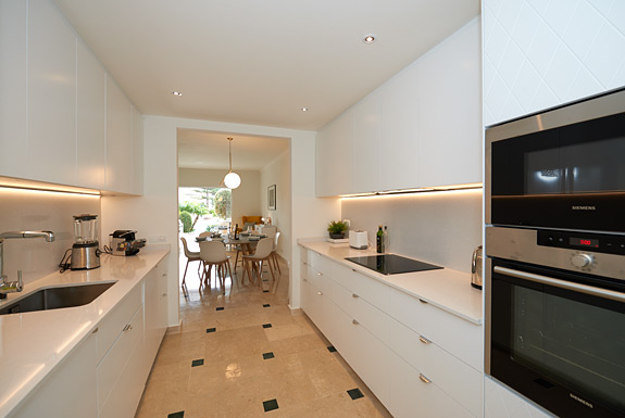 The stylish kitchen has silestone worktops and top of the range appliances, including a microwave, electric oven, induction hobs, American style fridge with separate full length freezer (180 cm high each), dishwasher, washing machine, kettle, De-longi coffee machine, blender, toaster etc.