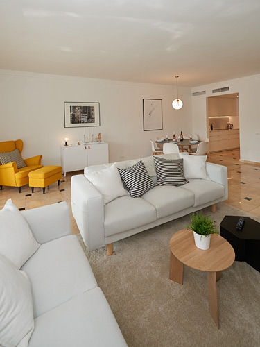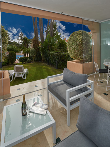 The lounge opens onto a lovely covered terrace with an outdoor sofa & a dining area that overlooks your private garden; with its glass curtains this terrace can be enjoyed all year round.