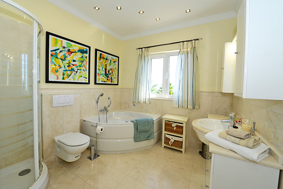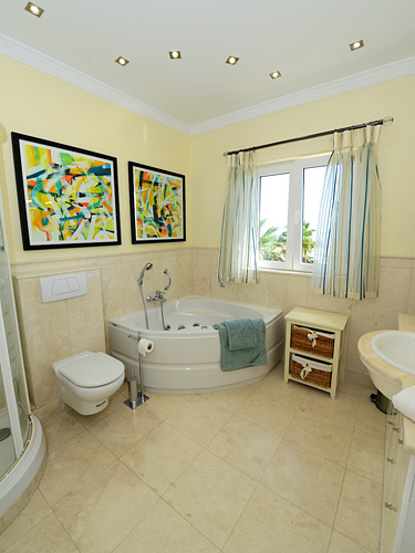 Up a flight of stairs is the master family suite with two bed - rooms and a bathroom. The first bedroom has a super king size bed (1.8 m wide), TV with DVD-player. This room has access to two private balconies with its own sun beds, table & chairs. The second bedroom has a single bed suitable for one guest. The room is on the north side of the villa and does not have air conditioning. The room has an openable window and a fan is provided. The bathroom boasts a bath and separate walk-in shower, wc and basin.