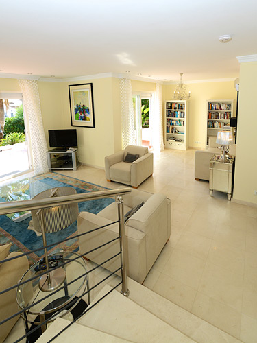 Down a flight of stairs from the dining room is the spacious open plan lounge and library area which has direct access onto the large private terrace that overlooks the pool and tropical gardens. This terrace has additional sun loungers with another outside dining table and chairs complete with sun or shade and lovely views. For your entertainment the lounge has a TV, DVD player and a IPTV system offering many channels including SKY sports and movies.